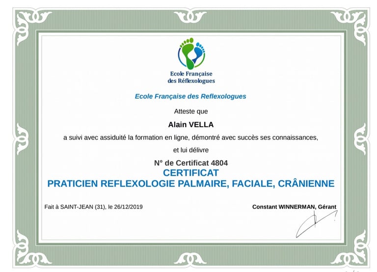 Au cours de mon parcours professionnel, j'ai eu l'opportunité d'obtenir plusieurs diplômes attestant de mes compétences en magnétisme et en réflexologie plantaire.